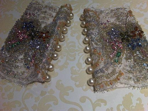 Handbeaded in France Swarovski crystal on French lace with creme silk sides and pearl buttons